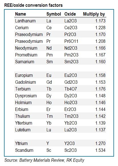 In fact one often has to convert between REE and REO when doing valuation calculations and it can be quite a substantial difference. For instance the conversion factor between Nd and Nd2O3 is 1.1664. The table adjacent contains a list of conversion factors from metal to oxide.