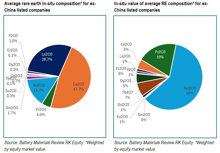 An analysis of the 30 REE developers and producers included in RK Equity/Battery Materials Review’s REE valuation tables yields an average in situ composition for all of the deposits included in the comparison in which La is 28% of the average composition and Ce 47%. HREEs comprise less than 2% of the in situ grade.