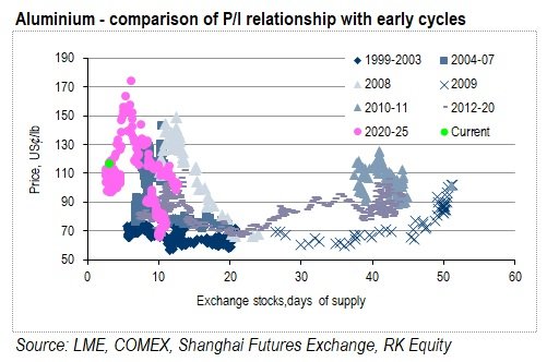The chart above looks at the Price/Inventory (P/I) relationship for copper and this one below looks at the P/I relationship for aluminium. As you can see, I’ve split the P/I relationship over time because over different periods, the P/I relationship has been different.