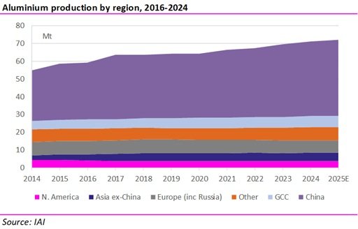 Capacity in the GCC region is much higher, with c.6.5Mtpa or 9-10% of global aluminium output. While it has been one of the fastest-growing production regions in recent years, issues around bauxite supply from Guinea have started to worry producers. Focus seems to be shifting to efficiency gains rather than wholesale capacity additions for now.