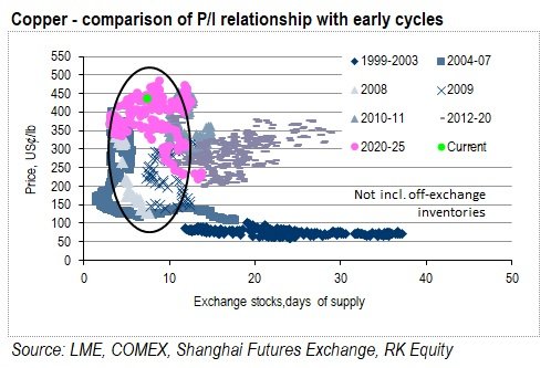 Over time there’s been a very strong – yet evolving – relationship between base metal prices and global exchange inventories. The chart below shows that relationship for LME copper vs global exchange inventories (stocks) on a days of supply (consumption) basis. For me as a commodities strategist it’s really important to look at inventories on a days of consumption basis rather than in absolute terms because there’s been a step-change in the magnitude of that consumption over the past 20 years.