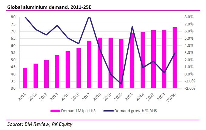 Global aluminium demand has grown at an average rate of 3.9% per annum over the past 15 years, although it has slowed considerably over the past five years due to the Pandemic and the slowdown in China’s property sector.