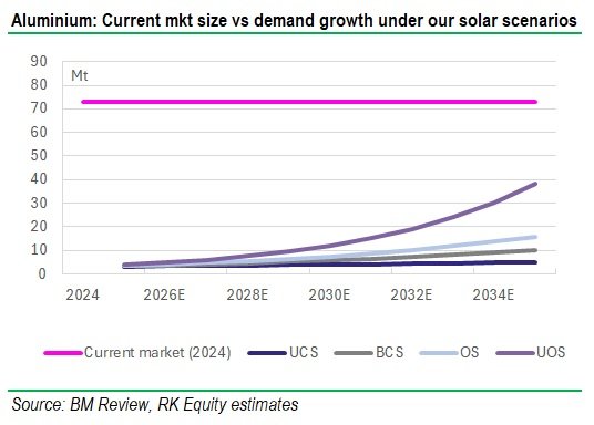 - Under my Base Case assumption, 2035E aluminium demand from solar would be 14% of the current market size.