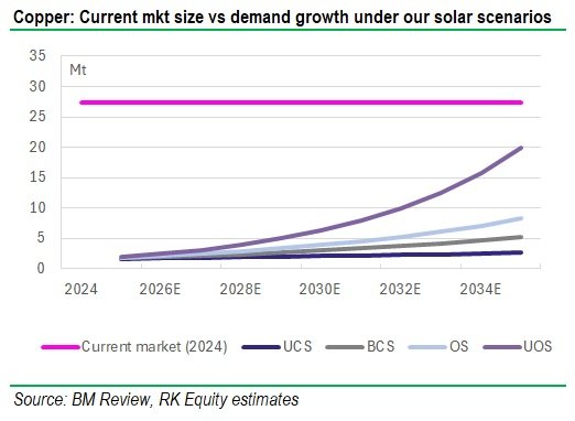 - Under our BCS, solar demand would still be 19% of the current copper market size in 2035 and under our OS it would be 30%. Even these numbers look extreme in the context of the copper mining industry’s current travails when it comes to adding new capacity.