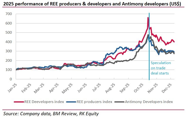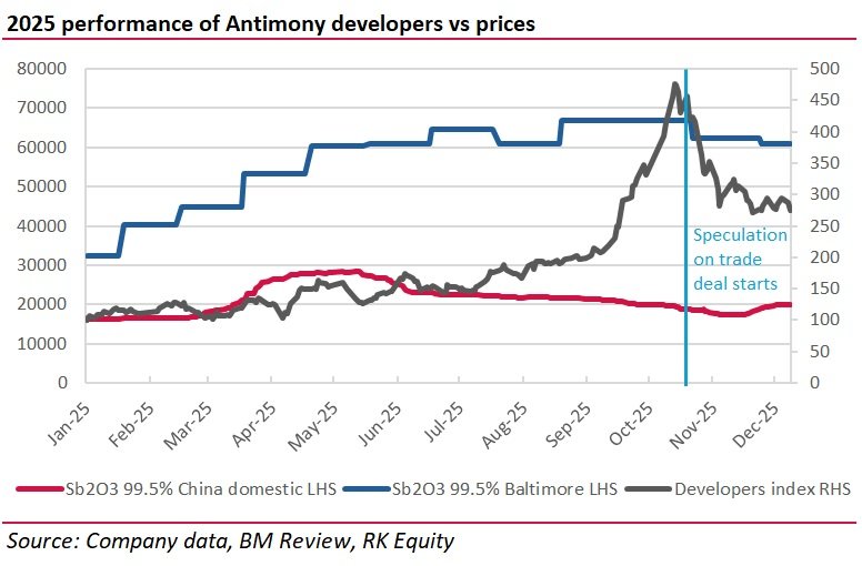 But prices of critical materials stocks have reacted like it does. And in two segments in particular there has been a huge equity sell-off, which is not justified, in my view. I’m talking about antimony and rare earths. In these segments, stocks with development projects, and some producers, are down 30-40% since mid-October. This seems completely unjustified to me.