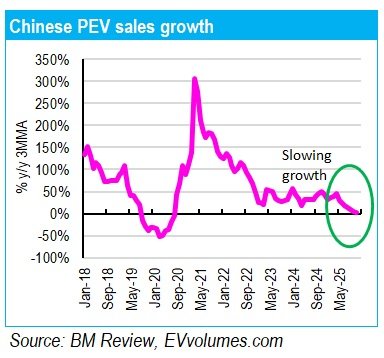 But, anyway, lets focus down a little more. In 2024, Chinese EV sales grew 37% y/y. In January 2025 I forecast +22% for 2025 and current data suggests a growth rate of c.18-20% y/y, which has slowed into the end of the year. And that slowdown has come about because of the withdrawal of the cash for clunkers scheme in some cities and provinces in the second half of the year. Given the focus of the most recent Chinese five-year plan, it seems that the government is happy with the development of the EV industry and it is likely to continue to withdraw subsidy support over coming months, which means that the rate of growth of EV sales could continue to slow.