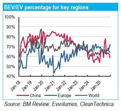There’s a lot of variability between regions but, on average, we’ve seen BEVs gain market share in 2025, after PHEVs gained market share in 2023 and 2024. If battery prices rise this year, it’s possible that we will see PHEVs taking more market share if consumers become elastic to higher prices. This will be particularly important in the Chinese market, in my view.
