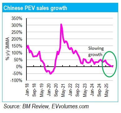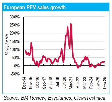 That trend has been very much carried through into EV markets; in H1/25, EV sales rose 30% y/y in China, in H2/25 they were only up 4%.