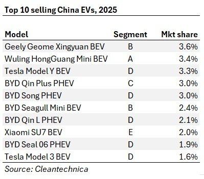 One big loser in 2025 in China seems to be Tesla, which saw its sales decline 5% y/y. The Model Y lost its top place and the Model 3 remained outside the Top 10. It looks increasingly like Tesla has peaked in the Chinese market.