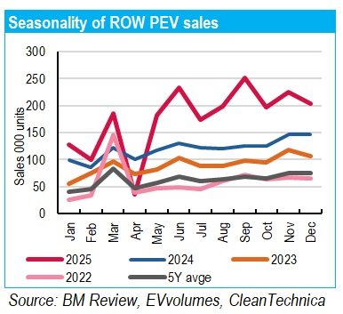 Well, in my 2025 outlook piece at the start of last year I suggested that ROW could be a larger EV market than the US at the end of the year. And it managed it handily, with 2.1m units sold in 2025 vs 1.5m in the US.