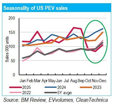 It’s fair to say that I (along with most commentators) thought that, given the Trump Administration’s stance on EVs, US EV sales growth would be negative in 2025. The major surprise was actually that they stayed in the black for as long as they did, before nosing over in the fourth quarter.