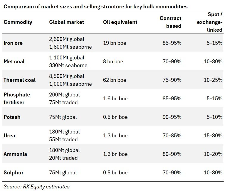 Arrangements like this can help to reduce volatility, better reflect regional market conditions and align pricing more tightly with physical flows. And indeed a big chunk of global bulk commodity trade still sits under this structure. Commodities such as thermal coal, iron ore and fertilisers still utilise buyer-seller contracts for in excess of 70% of their trade.